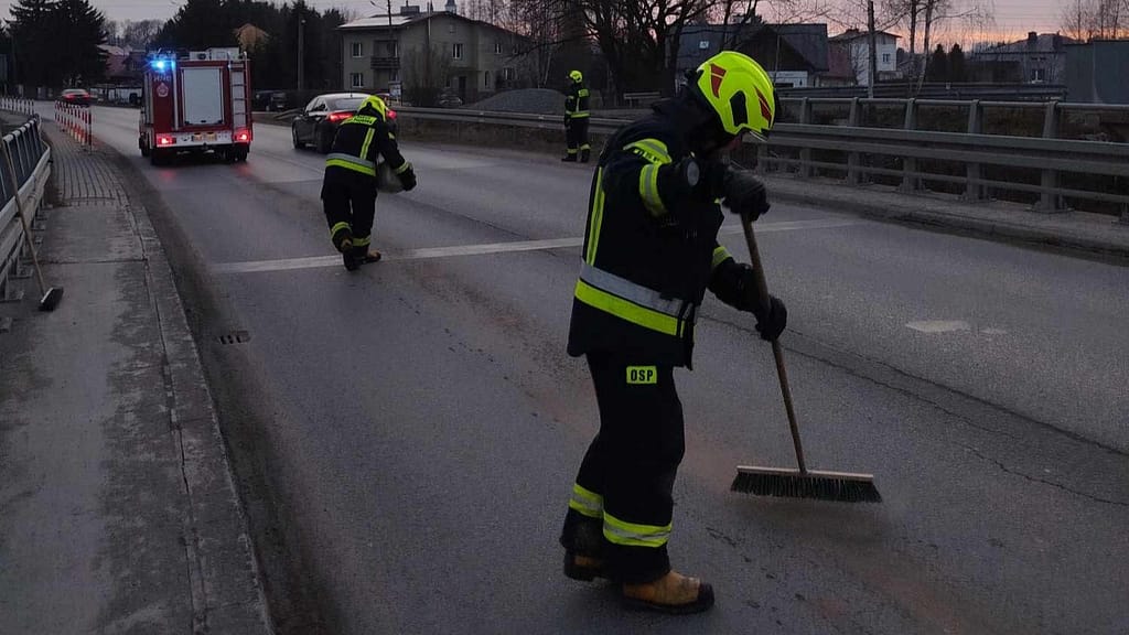 W sobotę 8 lutego zostaliśmy zadysponowani do usunięcia plamy oleju z drogi w miejscowości Zręcin. Plama ciągła się od ronda przy ul. Konopnickiej aż do mostu przy Świerzowej Polskiej. W działaniach brali również strażacy z JRG Krosno.
